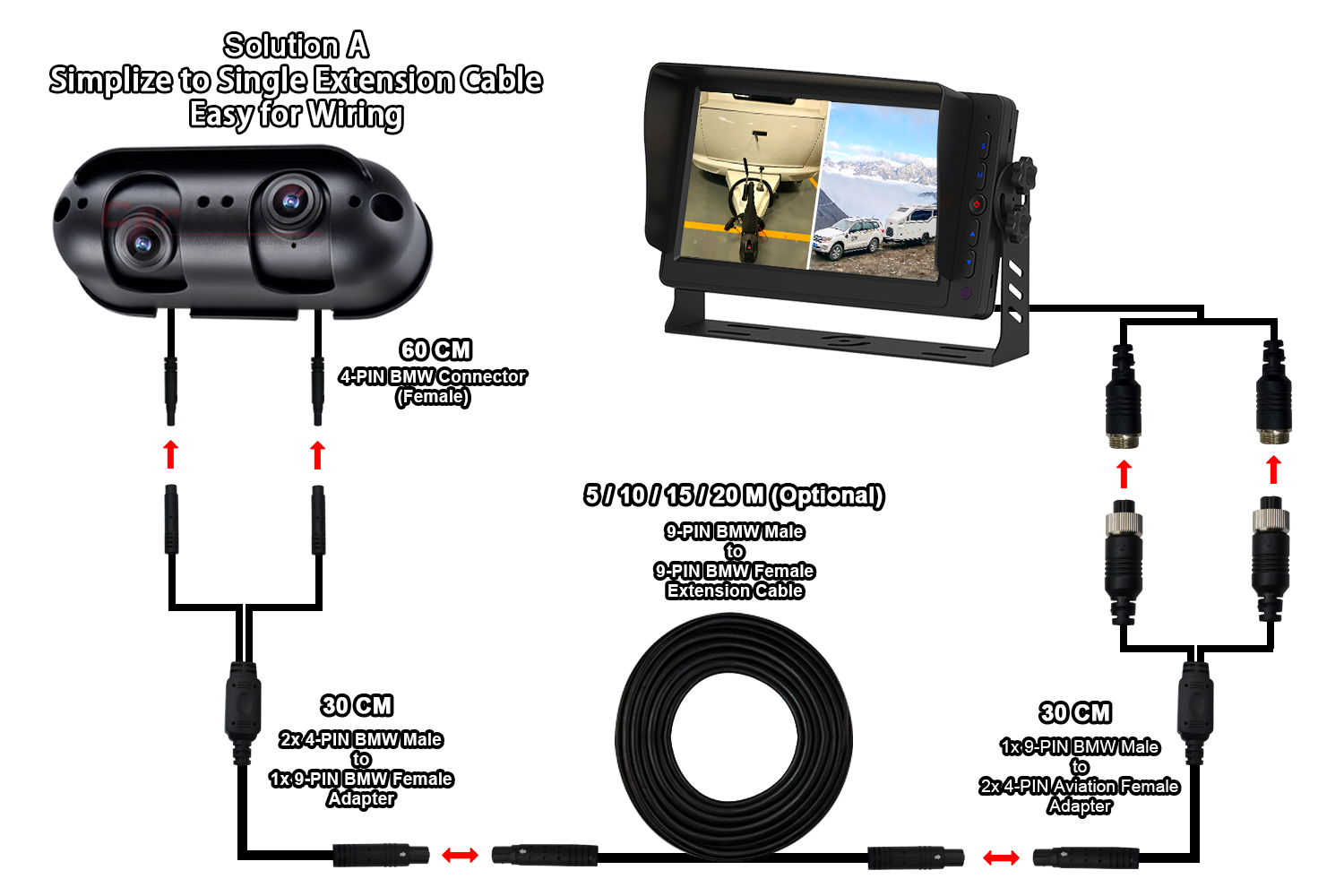 Cámara de visión trasera con detección de punto ciego AI Alarma de luz y sonido incorporadaCarleader AHD Starlight cámara de visión trasera de doble lente apta para autocaravana RV, una cámara AHD de herramientas privadas de nuevo diseño y excelente calidad, integrada con lentes duales en una cámara y un ángulo de lente ajustable por separado, que permite al usuario ver tanto de cerca como de lejos en el mismo monitor. Esta cámara no solo es apta para vehículos pesados, como camiones, autobuses, montacargas, etc.; También es adecuado para vehículos autocaravanas, como vehículos recreativos y caravanas.