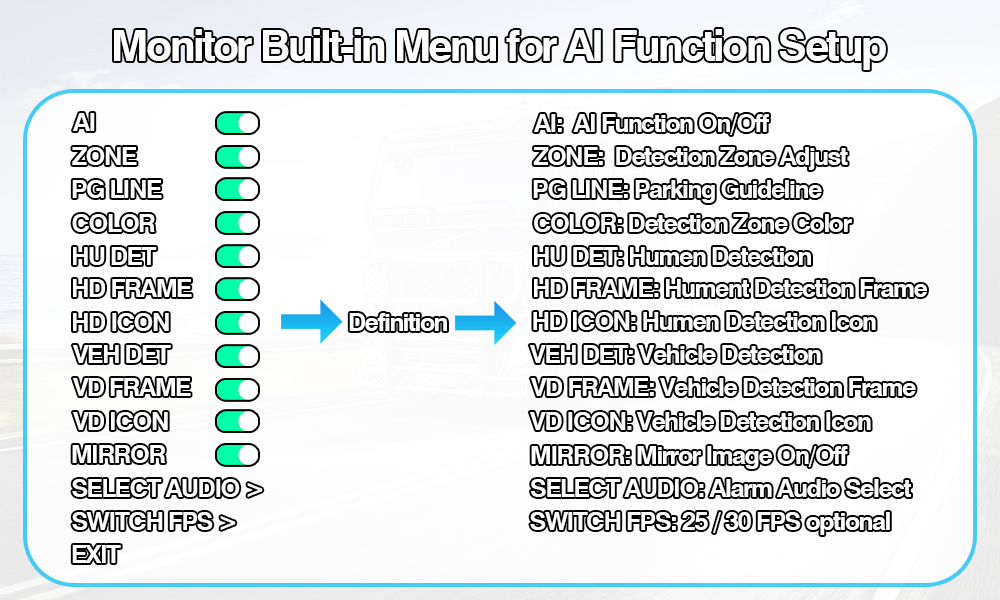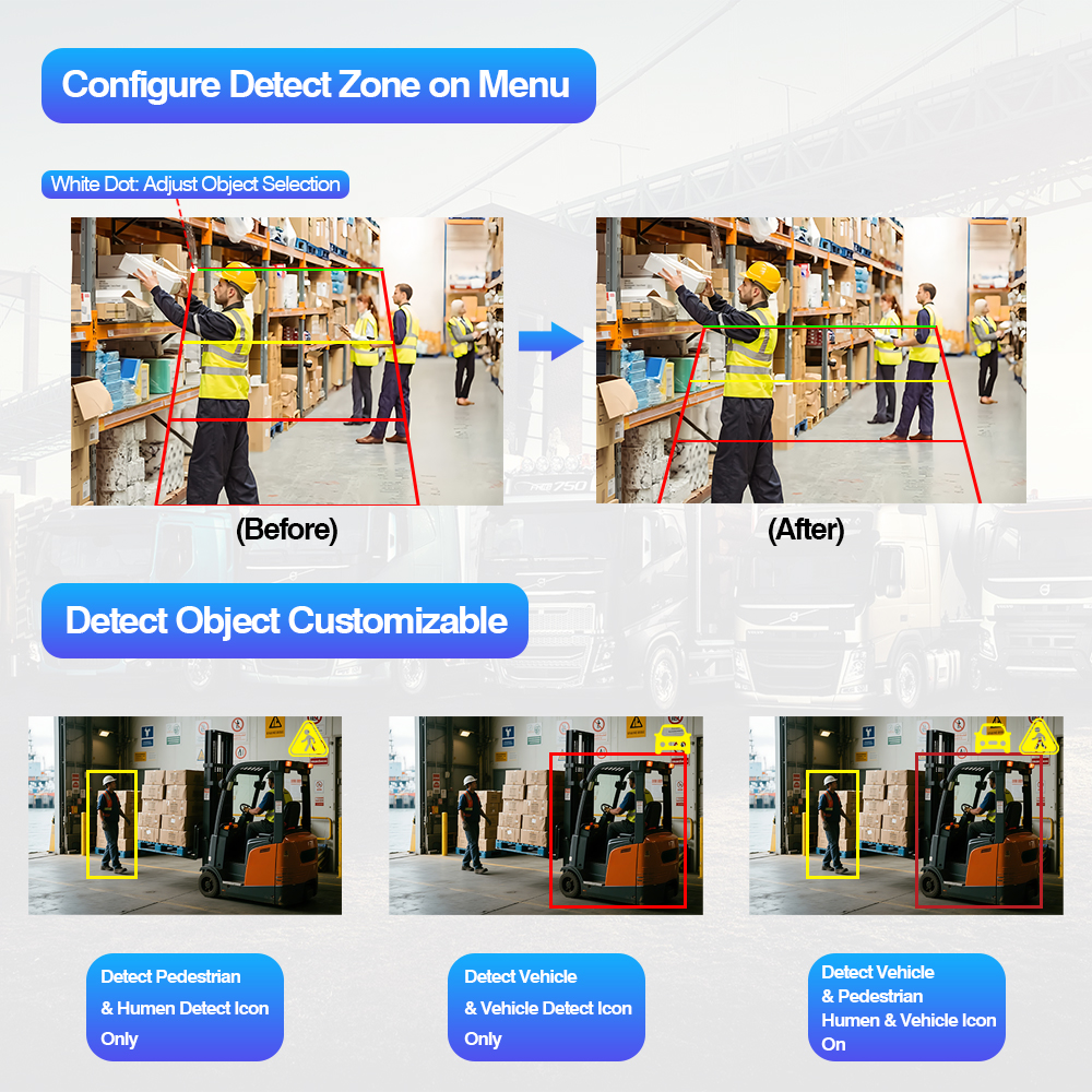 Cámara de visión trasera con detección de punto ciego AI Luz de advertencia que cambia de color incorporadaSistema de cámara de detección de punto ciego AI La luz de advertencia que cambia de color incorporada es un conjunto de seguridad inteligente para el vehículo que incluye una cámara AI BSD y un monitor AI que admiten la configuración de calibración AI, permiten al usuario cambiar la configuración AI, como el ajuste del tamaño del área de detección, el tipo de alarma de audio seleccionable, la detección de peatones activada/desactivada, la detección de vehículos activada/desactivada y cualquier otra configuración de calibración.