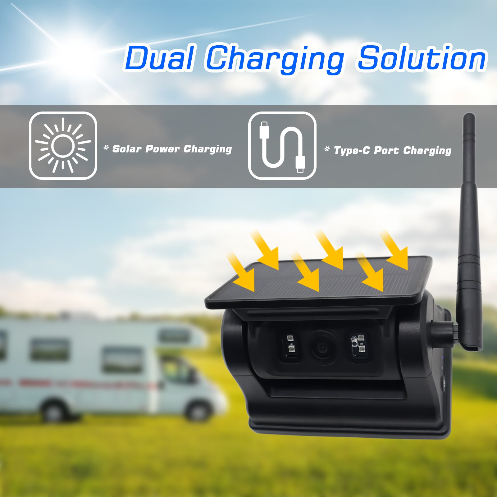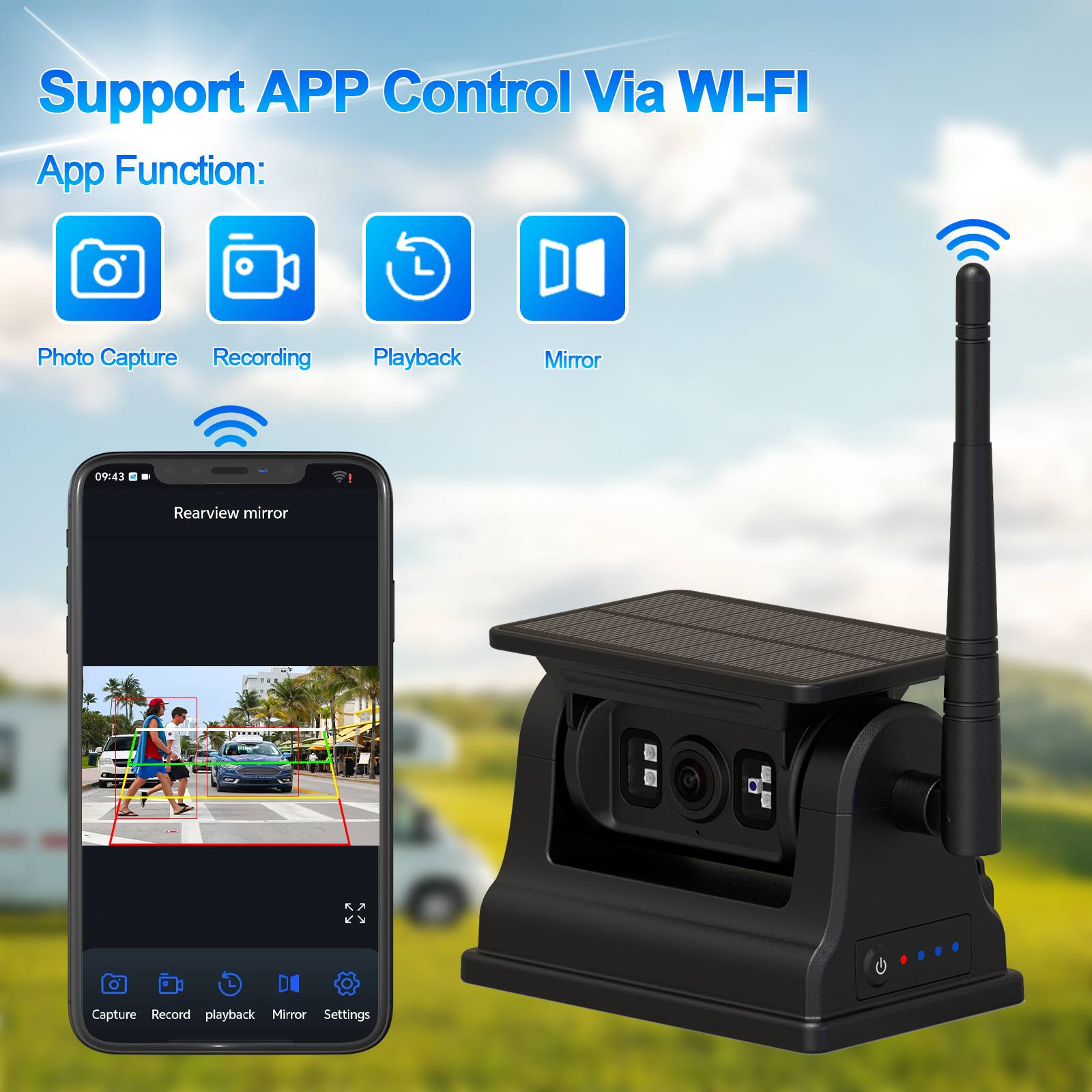 Monitor de vehículo IPS 2AV AHD de 9 pulgadas compatible con CarPlay MultimediaCarleader Cámara WIFI de marcha atrás recargable con energía Solar y detección de IA con Base magnética, no requiere cableado, fácil instalación con base magnética, cámara de marcha atrás inalámbrica con energía solar incorporada, batería recargable de 10500 mAh de gran capacidad y tiene función de visión nocturna, también puede funcionar con energía solar, ahorro de energía y protección del medio ambiente. La cámara admite la función de detección de IA, puede detectar peatones y vehículos, también sadmite conectarse con un teléfono celular a través de WIFI, permite al usuario capturar imágenes, grabar videos y reproducirlos, también ajustar la calibración de AI, etc. Esta cámara es su mejor opción como equipo de monitoreo de seguridad del vehículo para conducir su vehículo de manera segura.