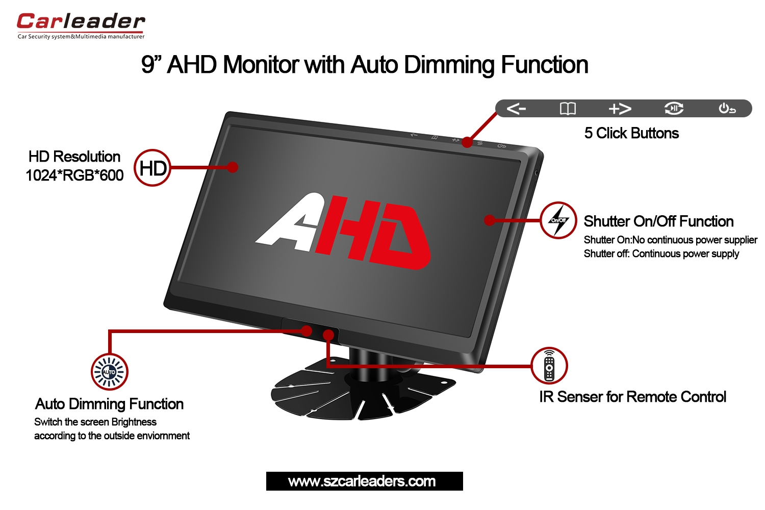La siguiente es la introducción detallada de Carleader Monitor de vehículo de alta definición de la pantalla IPS de 9 pulgadas. Como nuestro producto destacado, el monitor de vista trasera AHD Car AHD de 9 pulgadas con una pantalla IPS grande de 9 pulgadas y 1024*RGB*600 alta definición, proporcionando una imagen clara y vívida para una mejor visualizaciónexperiencia. También se presenta con sensor de atenuación automática, control remoto IR y Función de encierro/apagado de energía. El punto más especialeseso El monitor inverso de 9 pulgadas tiene botones de clic en la parte superior derechaesquina.