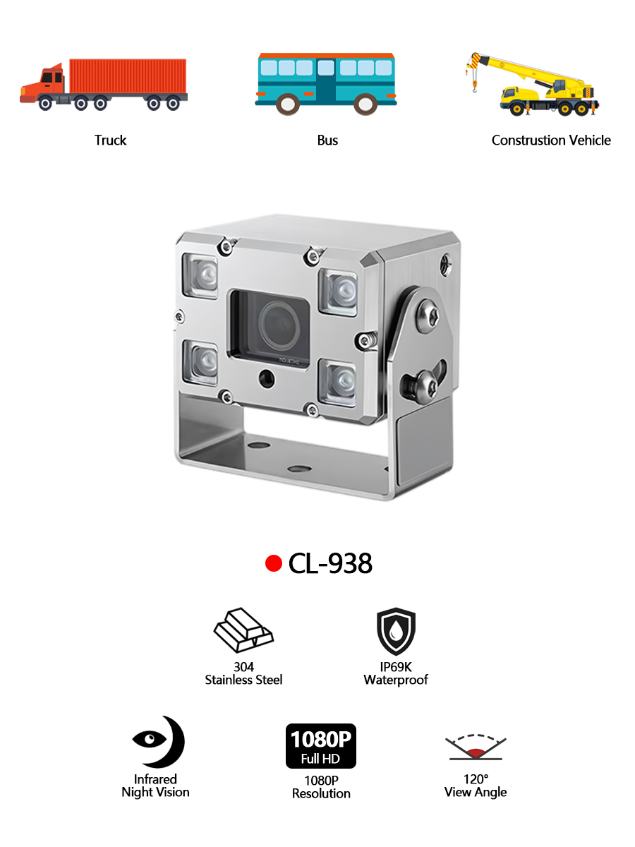 Carle304 cámara de servicio pesado de acero inoxidable, Vista trasera resistente y de alto rendimientoCámara AHDconstruido para ofrecer una vigilancia confiable en los exigentes entornos industriales y duros. Hecho a mano con acero inoxidable premium 304, combina una durabilidad excepcional con tecnología de imágenes avanzadas, asegurando la experiencia de seguridad y claridad en la conducción.