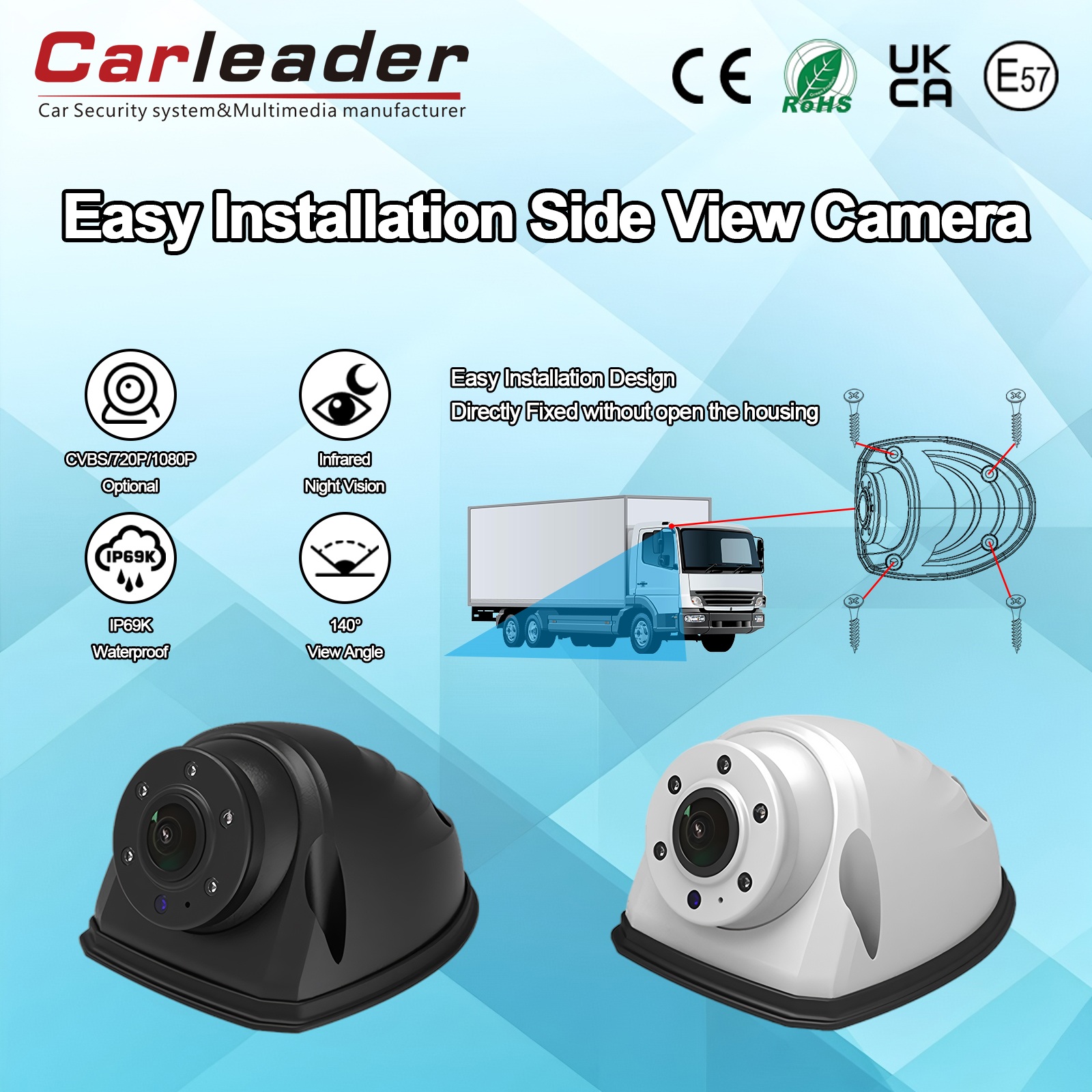 CarleInstalación fácil Cámara de vista lateral del vehículo pesadoes una vista lateral de alto rendimientoCámara AHDDiseñado para ofrecer una visibilidad clara en cualquier condición climática severa. Diseñado principalmente para su rendimiento multifuncional y duradero, este sistema de cámara compacta es adecuado para vehículos comerciales, equipos industriales y aplicaciones de seguridad donde se necesita una visión periférica clara.