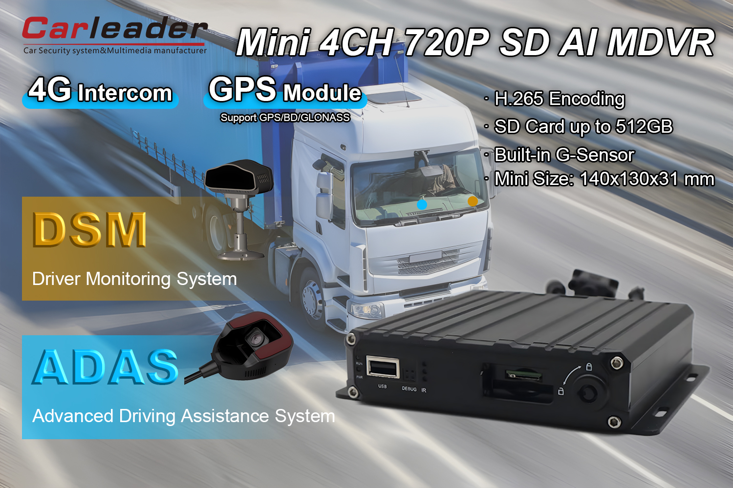 CarleaderDVR móvil inteligente con IA de 4 canales con cámara DSM y ADAS, un compacto y de alto rendimiento de 4 canales.y mdvr(grabador de vídeo digital móvil) diseñado para aplicaciones modernas de vigilancia y seguridad de vehículos. Al combinar capacidades avanzadas de IA con un diseño de hardware robusto, este dispositivo ofrece monitoreo, grabación y análisis inteligente de imágenes confiables en tiempo real en un factor de forma miniaturizado.