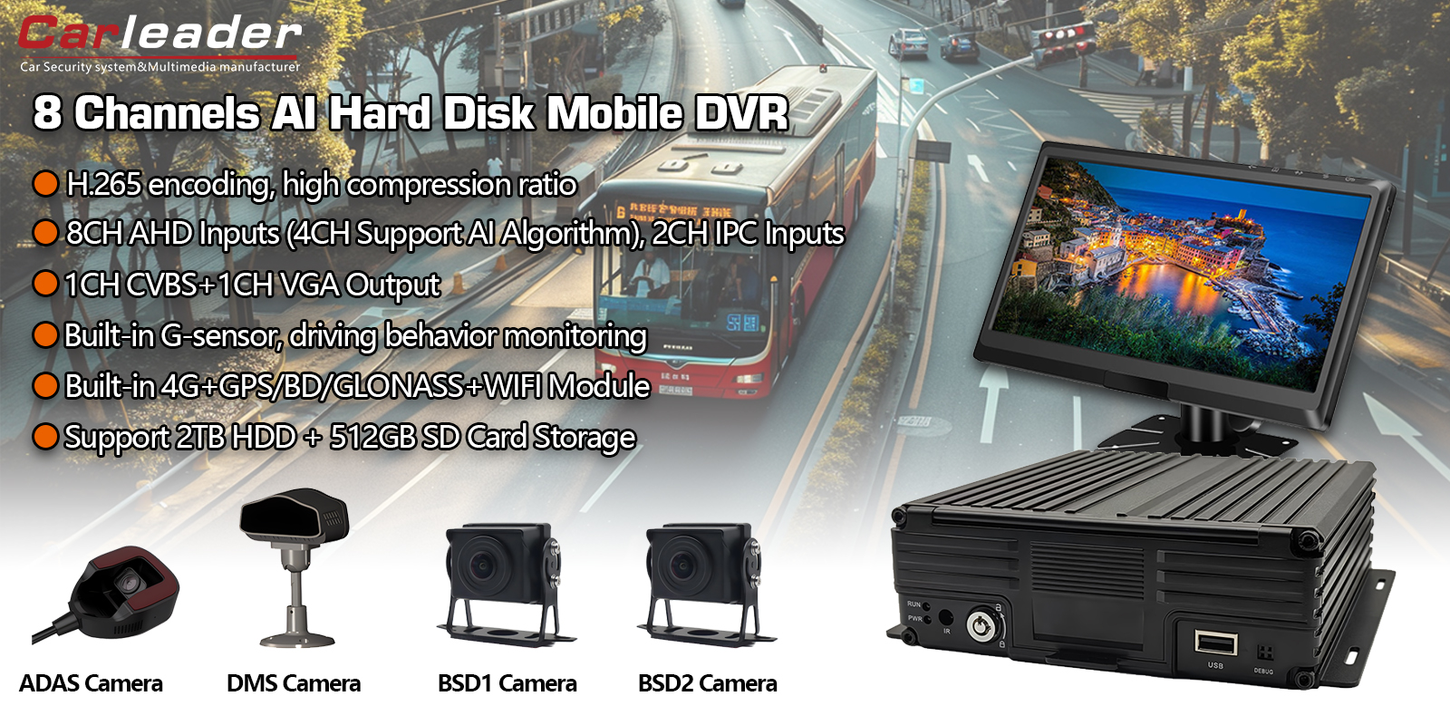 Carleader8CH AI HDD DVR móvil compatible con ADAS+DMS+BSDes la solución perfecta para flotas comerciales, transporte público, logística y vehículos especiales que requieren: