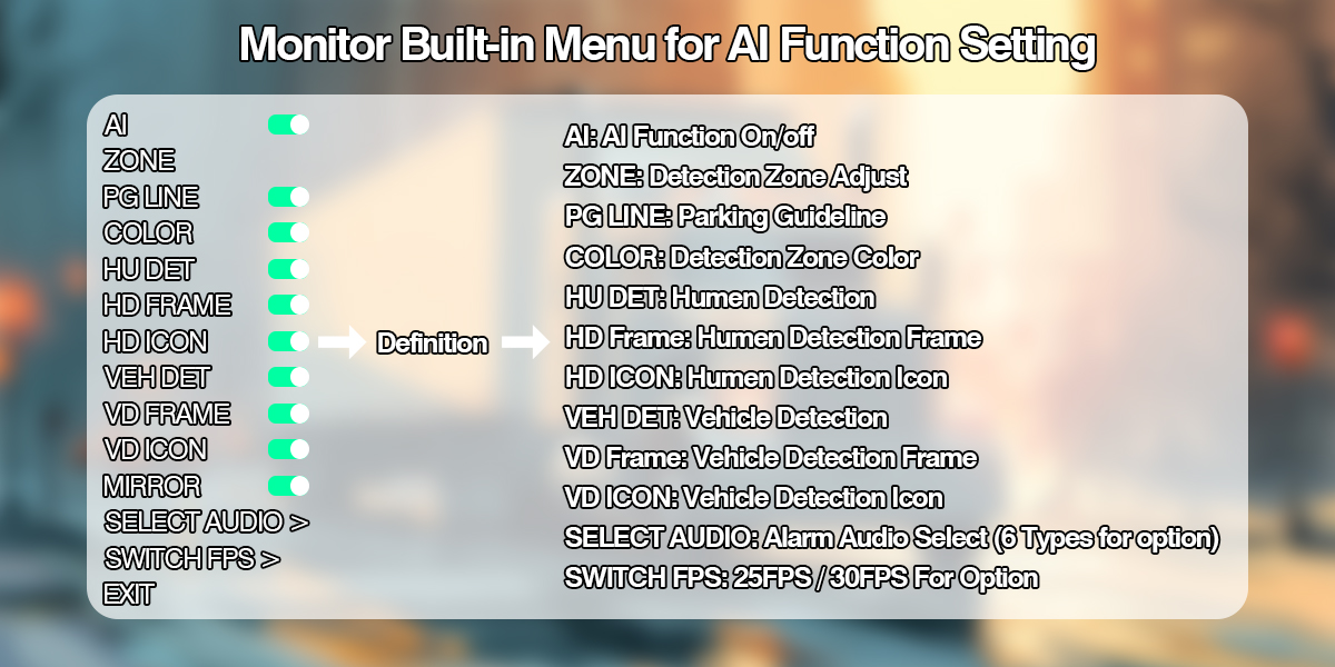 Monitoree el menú de calibración AI incorporado, todoLos usuarios pueden ajustar libremente el tamaño del área de detección (Zona de detección) en la pantalla para adaptarse a diferentes situaciones de visualización causadas por diferentes posiciones y ángulos de instalación. Además del ajuste del área de detección, hay más funciones de IA que permiten al usuario cambiar la configuración (verifique la siguiente imagen).