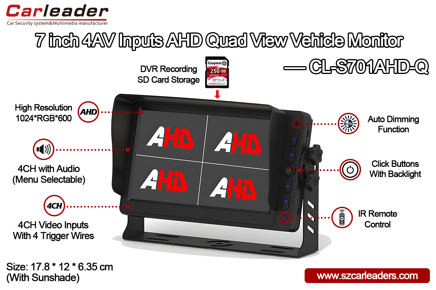El monitor Carleader de 7 pulgadas, 4 canales AHD, con pantalla de vista cuádruple admite la función de grabación DVR, con ranura para tarjeta SD en la parte posterior del monitor, la capacidad máxima es de hasta 256 GB. Las funciones con función de grabación en bucle pueden grabar automáticamente el video y la reproducción de la cámara.