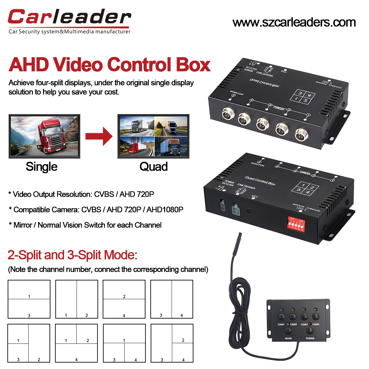 Hablemos de lo que necesitas saber sobre CarleaderProcesador de vídeo AHD Quad View Split Boxpara vehículos pesados. La caja de control AHD quad split es un dispositivo importante para el sistema de monitoreo CCTV de un vehículo. La caja de control dividido de video para camión de autobús admite convertir un solo monitor en un monitor de vista cuádruple y se puede conectar con 4 cámaras de automóvil AHD. La siguiente es una explicación detallada de las funciones, características y casos de uso típicos de la caja de control de video de la cámara retrovisora AHD.
