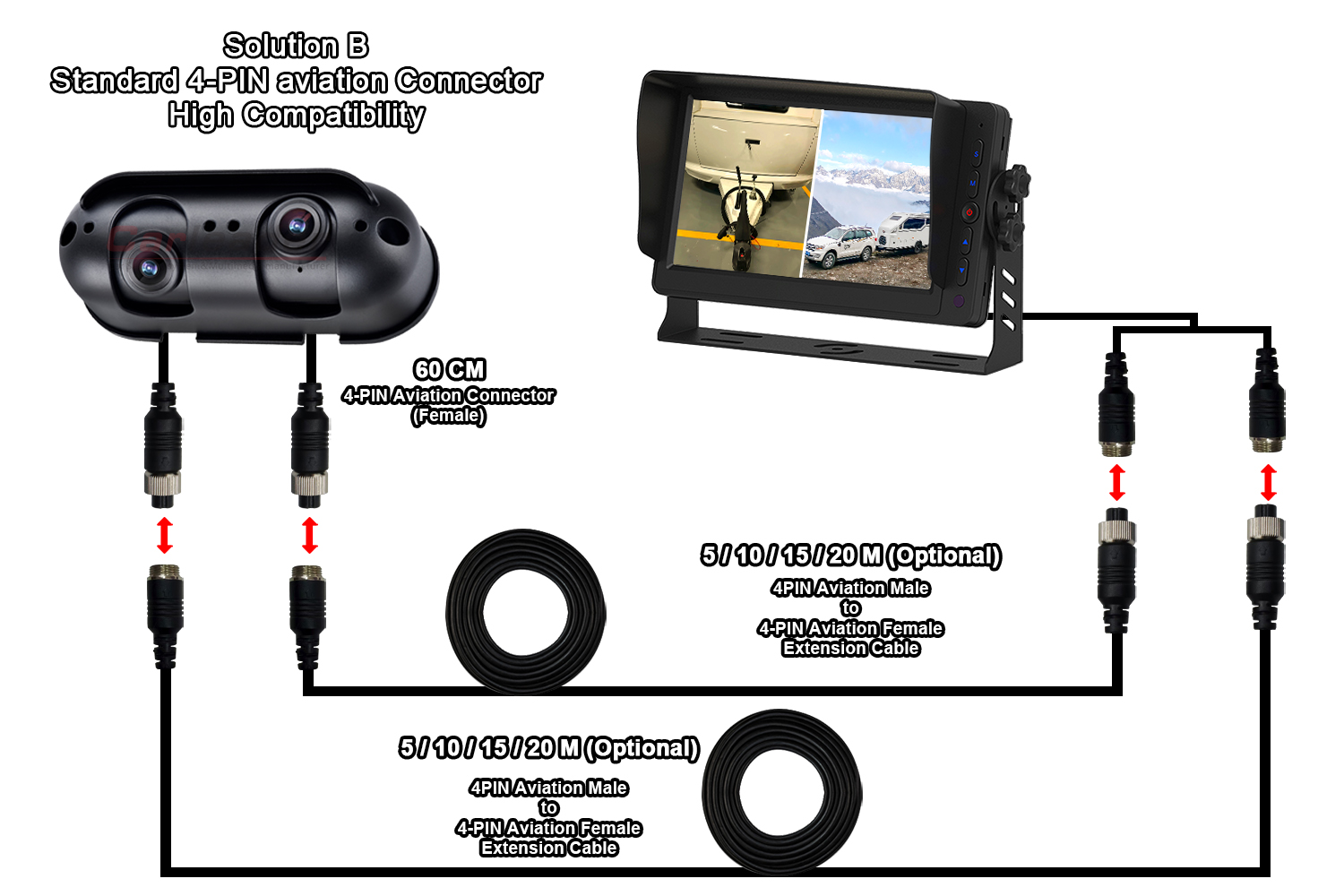 Carleaderofrecerá dos soluciones de cableado diferentes para la cámara de visión trasera de doble lente AHD Starlight apta para autocaravana RV, para adaptarse a diferentes necesidades de cableado:
