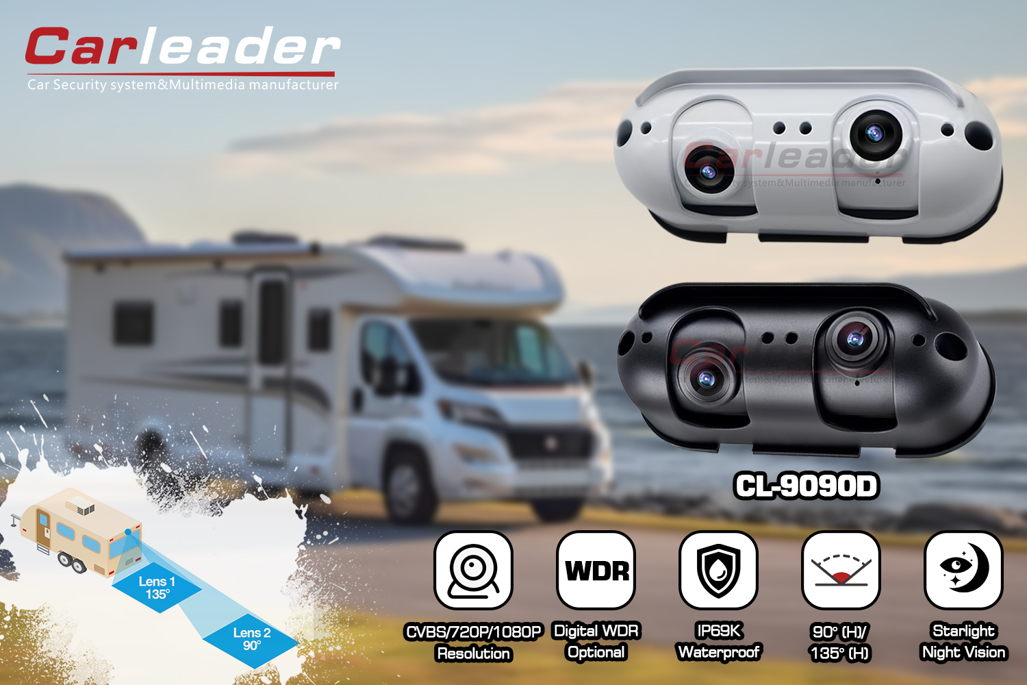 CarleaderCámara de visión trasera de doble lente AHD Starlight apta para autocaravana RV, una cámara de visión trasera AHD de herramientas privadas de Carleader, el diseño de doble lente permite al usuario tener un rendimiento de visibilidad clara de la vista trasera de cerca y de lejos. Su carcasa de aleación de aluminio y su clasificación IP69K hacen que la cámara sea más resistente y duradera en cualquier condición climática adversa. Esta cámara no solo es apta para vehículos pesados, como camiones, autobuses, montacargas, etc.; También es adecuado para vehículos autocaravanas, como vehículos recreativos y caravanas.