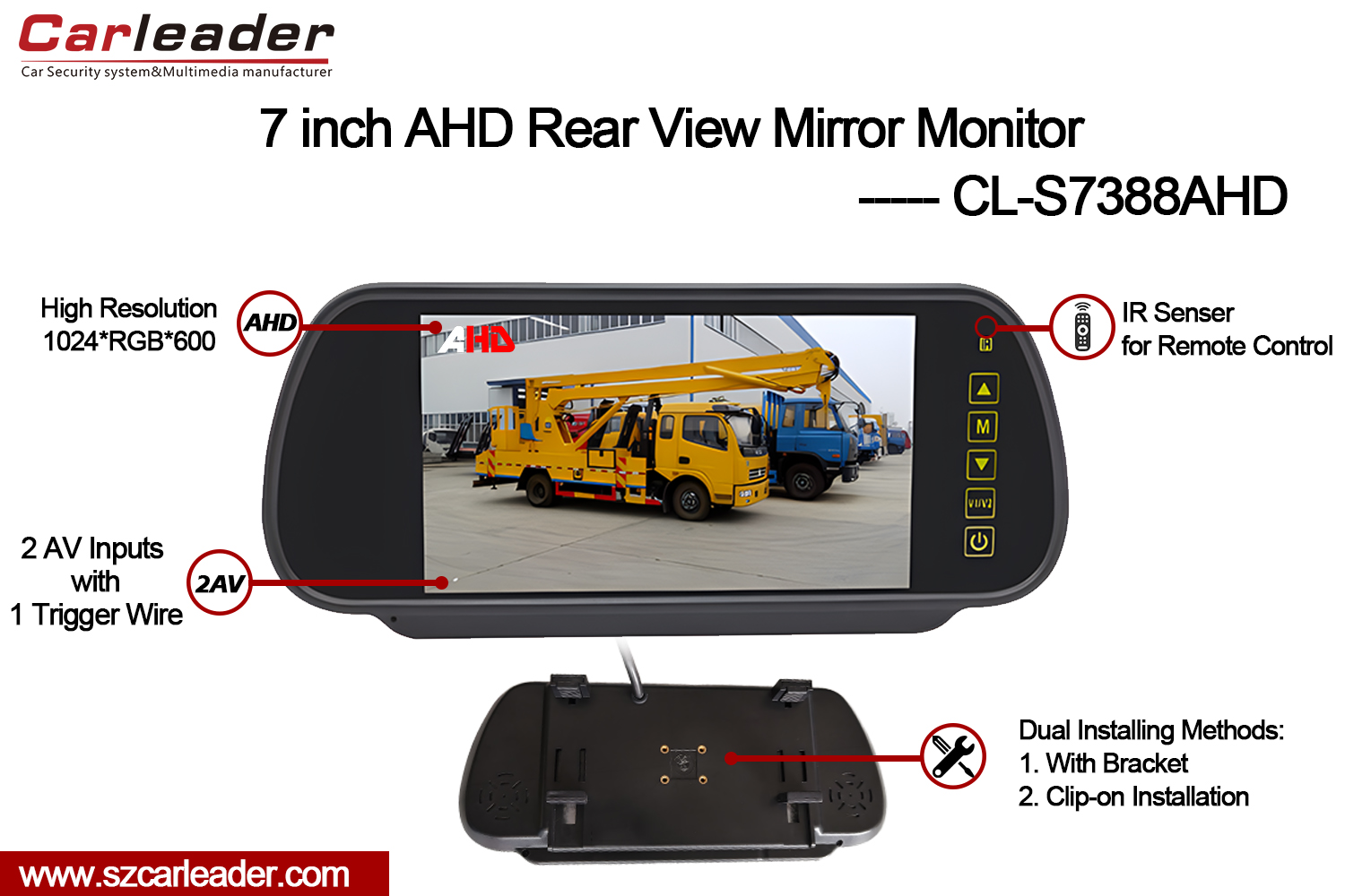 CarleaderMonitor AHD con espejo retrovisor TFT LCD de 7 pulgadases un monitor AHD de espejo para automóvil de 7 pulgadas de alto rendimiento diseñado para brindar claridad y versatilidad excepcionales para los sistemas de monitoreo de vehículos modernos. Al combinar funciones avanzadas con un diseño fácil de usar, este monitor garantiza un rendimiento confiable en diversas condiciones de conducción.